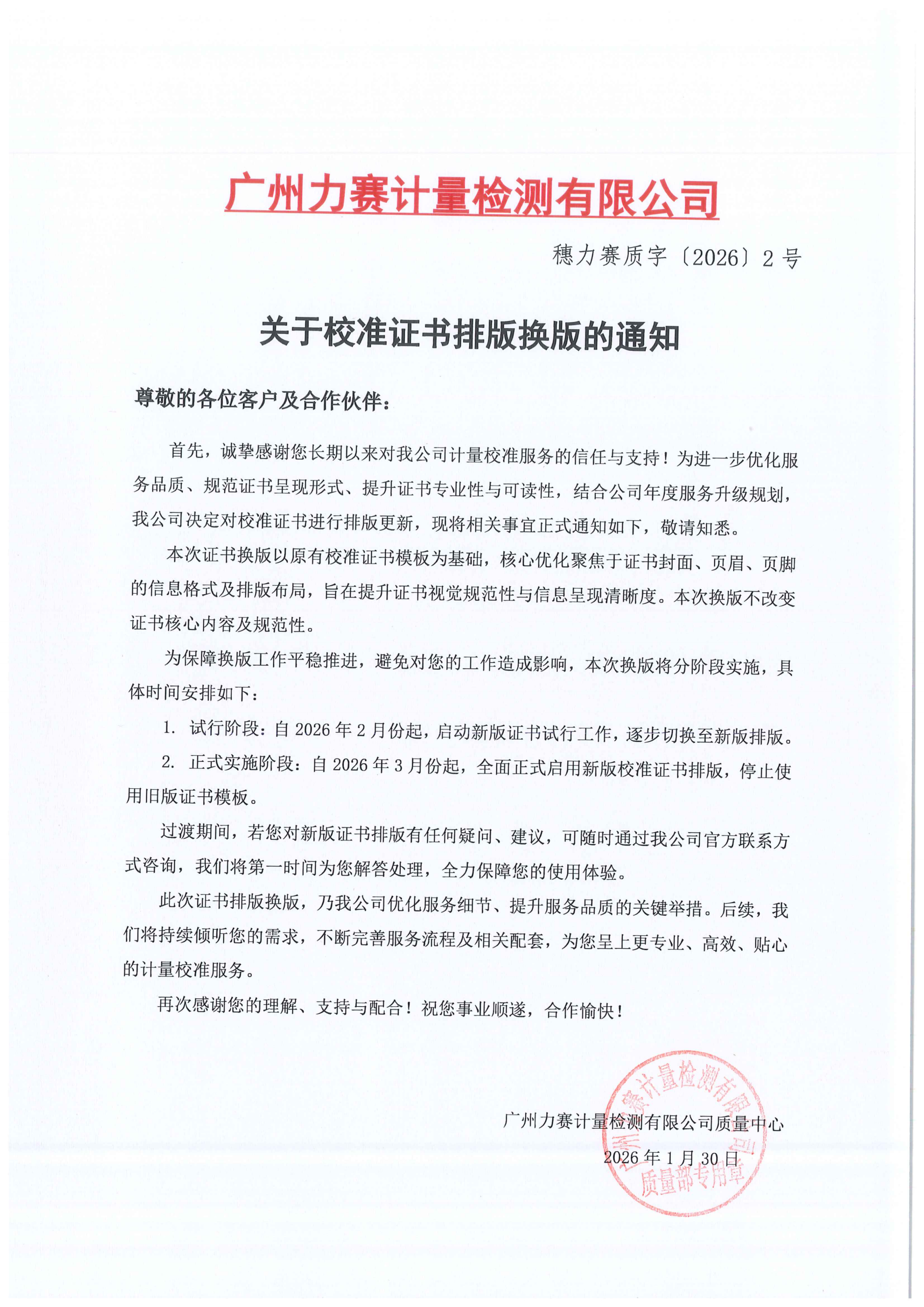 关于校准证书排版换版的通知